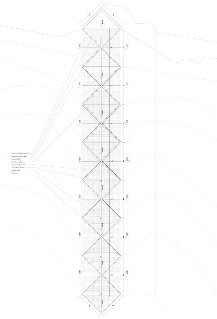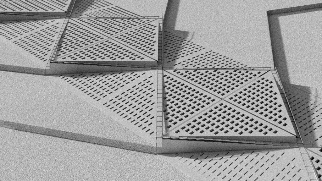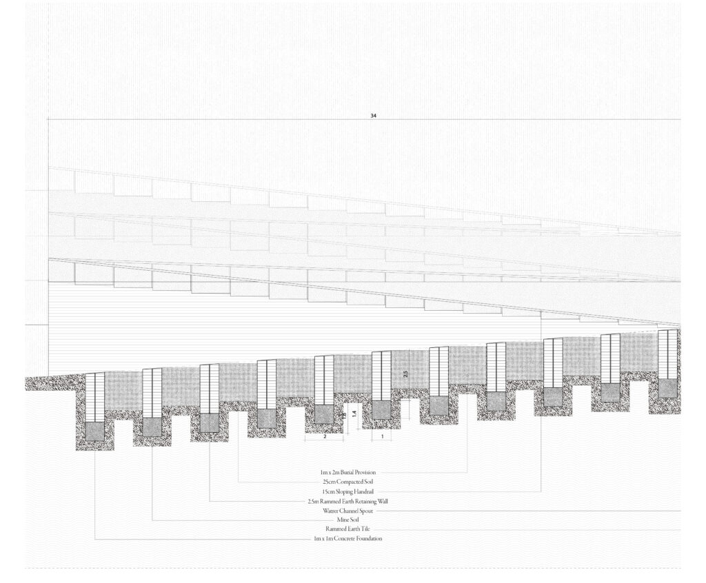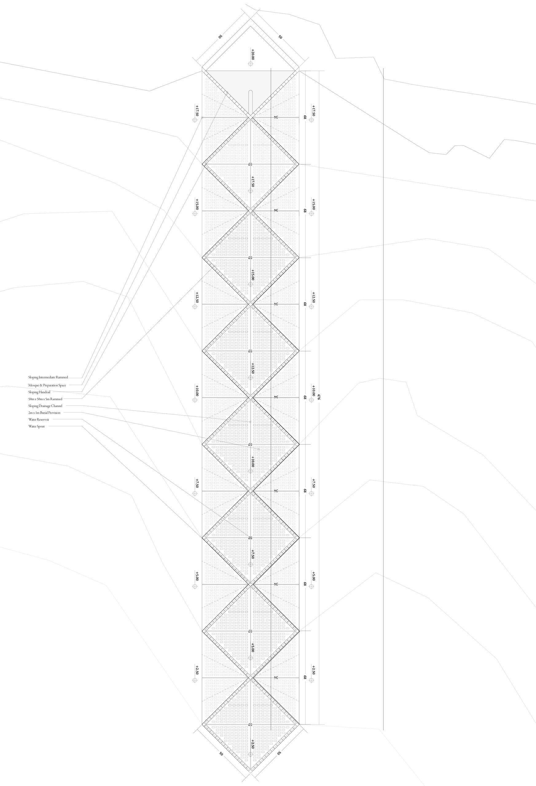 As visitors approach the cemetery, their gaze is drawn to the triangular sloping structure that postures as a sanctuary of rituals surrounding death. Within its walls, sacred rituals take place, including prayers, body preparation and wrapping, honoring the departed and their journey onto the next phase of existence. Adjacent to the building, a series of cemetery platforms are placed, cascading down the landscape on different levels. These platforms offer a resting place for the departed, creating a visual testament to the interconnectedness of life and death. Each platform serves as a symbolic bridge between the earthly realm and the realm beyond, inviting visitors to contemplate the transient nature of existence and the eternal cycles of regeneration.