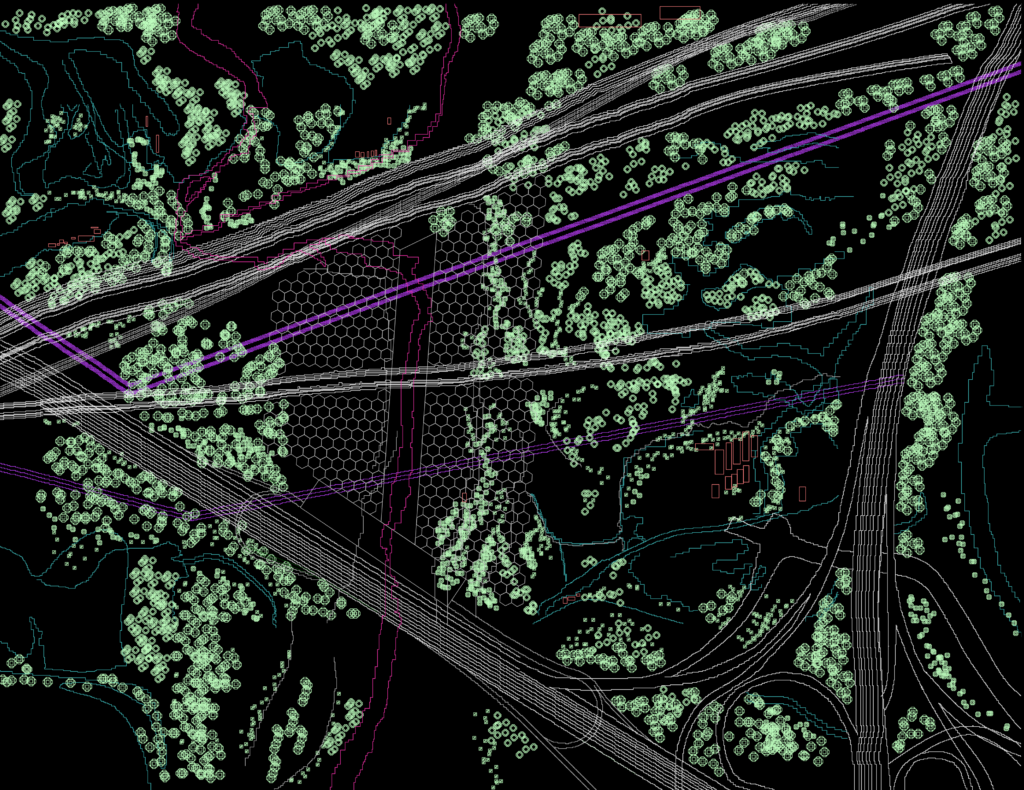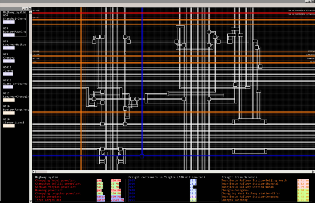 The site’s location near the Cuntan village in the Jiangbei district of Chongqing has been chosen because of the previously mentioned oversaturation of underlying networks, allowing the system within the proposed project to access large amounts of flows and providing a necessary redundancy in case of failure. The site is transversed by the G50 Shanghai-Chongqing expressway, spanning almost 2000 kilometers in length East-West, and the G65 Baotou–Moming expressway, 3000 kilometers in length, connecting cities of Inner Mongolia with Guangdong in the South. The site is crossed by six railway lines and an affluent ending in the Yangtze River, and the project’s placement also offers a tapping into 220 kW electricity lines. Furthermore, the site is well linked to global networks due to its proximity to Chongqing Jiangbei International Airport, Cuntan’s New International Town and Lianglu Cuntan Free Trade Port Area, China’s only bonded inland port.
