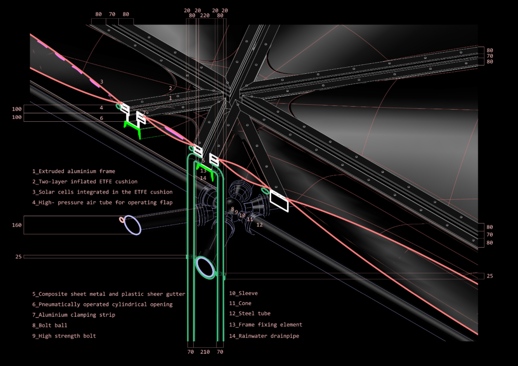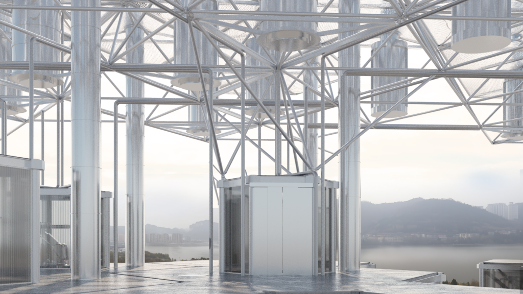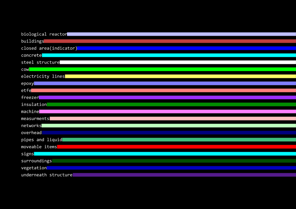 Regarding the living environment, cows prefer both grazing in pastures as well as being in a sheltered space, in a way that they can freely choose.[24] This precondition is also provided in the project, as animals can browse through the adjacent fields to the building, as well as take shelter under it, where they are willing to return due to the steady dispensation of food. If the cell proliferation techniques were perfected,[25] the factory, dedicated to the whole Chongqing municipality, could suffice by using tissue samples from a single cow, limiting the number of involved animals to an absolute minimum.