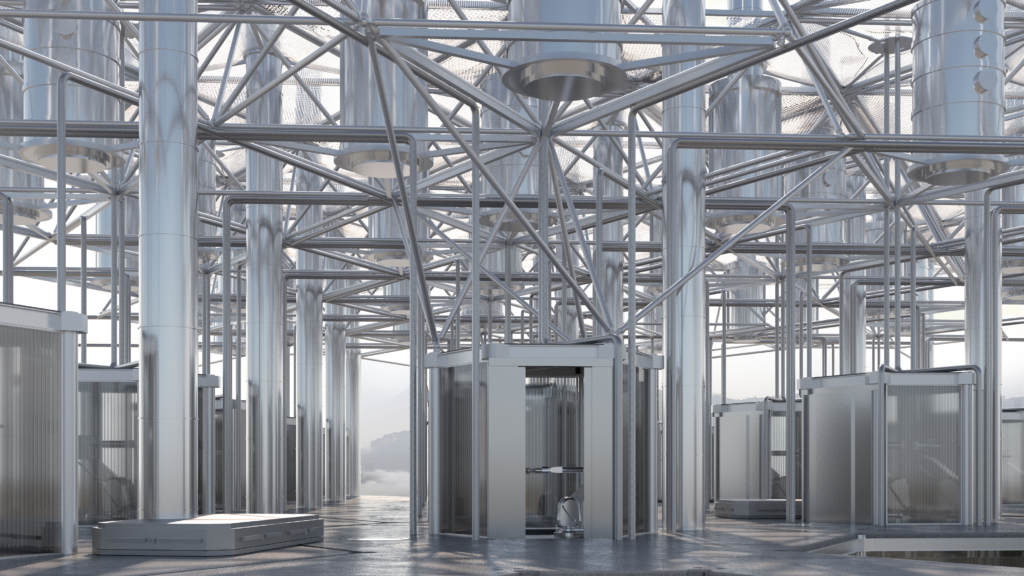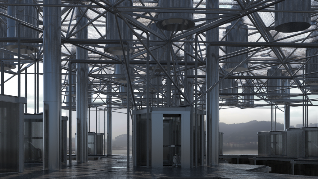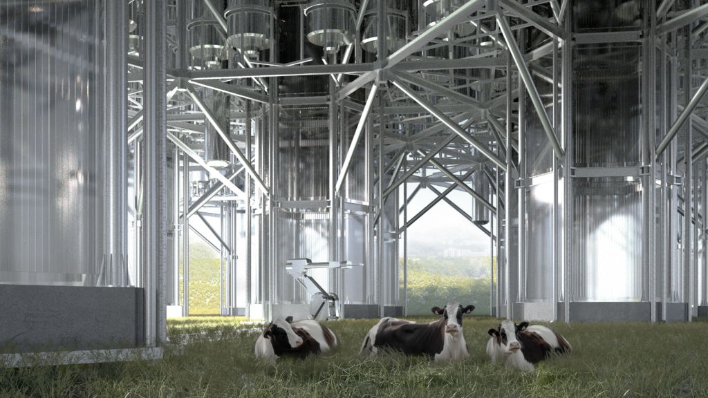 A post-anthropocentric condition is aimed for as the design of the structure seriously considers the well-being of cows, creating an unapologetically techno-environmental landscape that aims to provide all the necessary comfort, while still being very close to vegetation and flowing water.