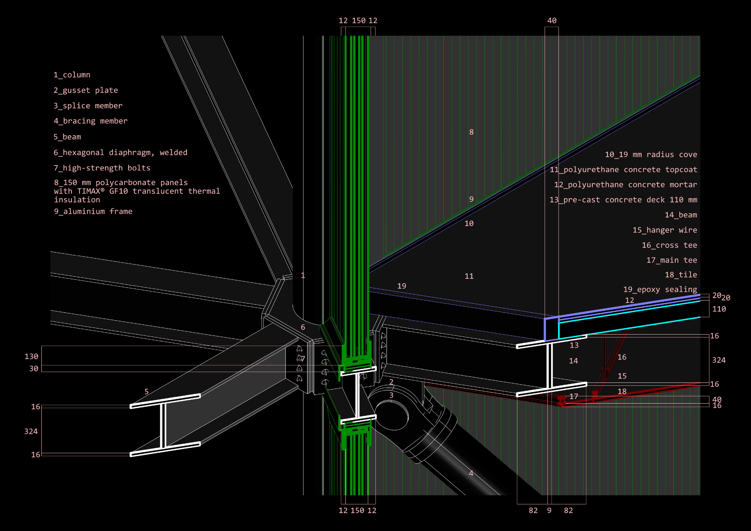 A post-anthropocentric condition is aimed for as the design of the structure seriously considers the well-being of cows, creating an unapologetically techno-environmental landscape that aims to provide all the necessary comfort, while still being very close to vegetation and flowing water.